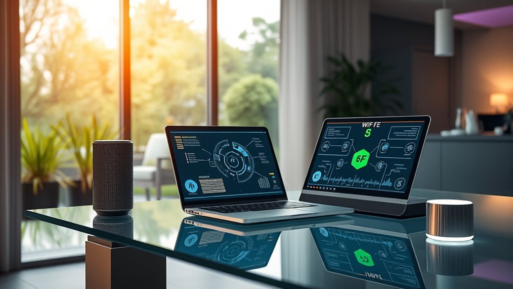 Wi-Fi 6E introduces unique security features like improved device compatibility and adherence to stricter regulatory standards. You benefit from enhanced encryption protocols, such as WPA3, which make your network more secure. The new technology also supports better device authentication, reducing vulnerabilities. These features help guarantee your smart home devices stay protected against emerging threats, giving you peace of mind while enjoying faster, more reliable Wi-Fi connectivity.