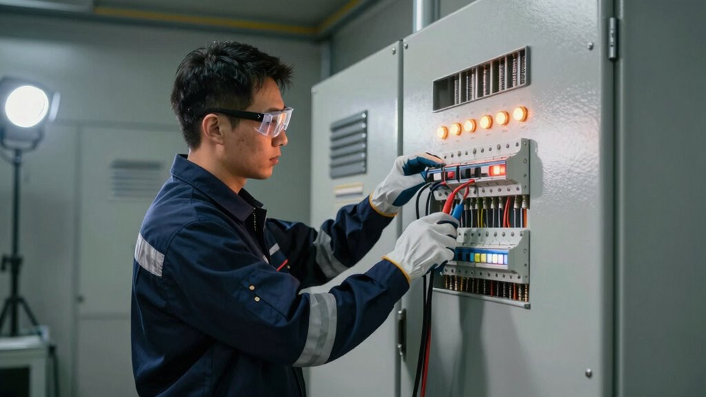 Wearing personal protective equipment (PPE) is essential to safeguard yourself during emergency power system testing. PPE, such as insulated gloves, safety glasses, and flame-resistant clothing, shields you from electrical hazards and potential arc flashes. Always follow established safety protocols to minimize risks, including inspecting your PPE before use and ensuring it fits properly. Stay alert and keep your focus on the task, avoiding distractions that could lead to accidents. Remember, PPE is your first line of defense; never compromise on safety gear. Additionally, understanding modern safety technology can enhance your awareness and response during testing procedures. Being familiar with safety protocols helps you react quickly and appropriately if an emergency occurs. Regularly reviewing emergency response procedures ensures you are prepared to act swiftly in case of an incident. Familiarity with market regulations can also help you stay compliant and safe during testing. Moreover, applying risk assessment techniques can help identify potential hazards before starting the procedure.