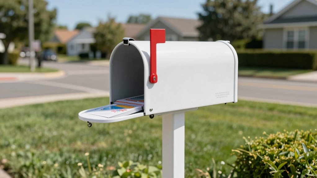 Your mailbox plays a significant role in shaping your home’s overall curb appeal. When visitors or neighbors see a well-maintained, attractive mailbox, it instantly boosts your home’s visual appeal. Mailbox aesthetics matter because they reflect your attention to detail and care for your property. A stylish, clean, and properly positioned mailbox creates a welcoming impression and complements your home’s exterior design. Conversely, a battered or neglected mailbox can detract from your home’s charm and make your property seem less cared for. Small improvements, like choosing a coordinating color or adding decorative elements, can dramatically enhance curb appeal. Additionally, ensuring your mailbox is properly positioned can make a noticeable difference in how your home is perceived from the street. Proper positioning not only enhances visual harmony but also aligns with home exterior design principles, contributing to overall attractiveness. Maintaining your mailbox’s structural integrity is essential to prevent it from becoming an eyesore over time. Regular cleaning and inspection help preserve its visual appeal and prevent deterioration. Remember, your mailbox isn’t just functional; it’s a key part of your home’s first impression. Keeping your mailbox in good condition can also increase your home’s perceived value, making it more inviting to visitors and potential buyers.