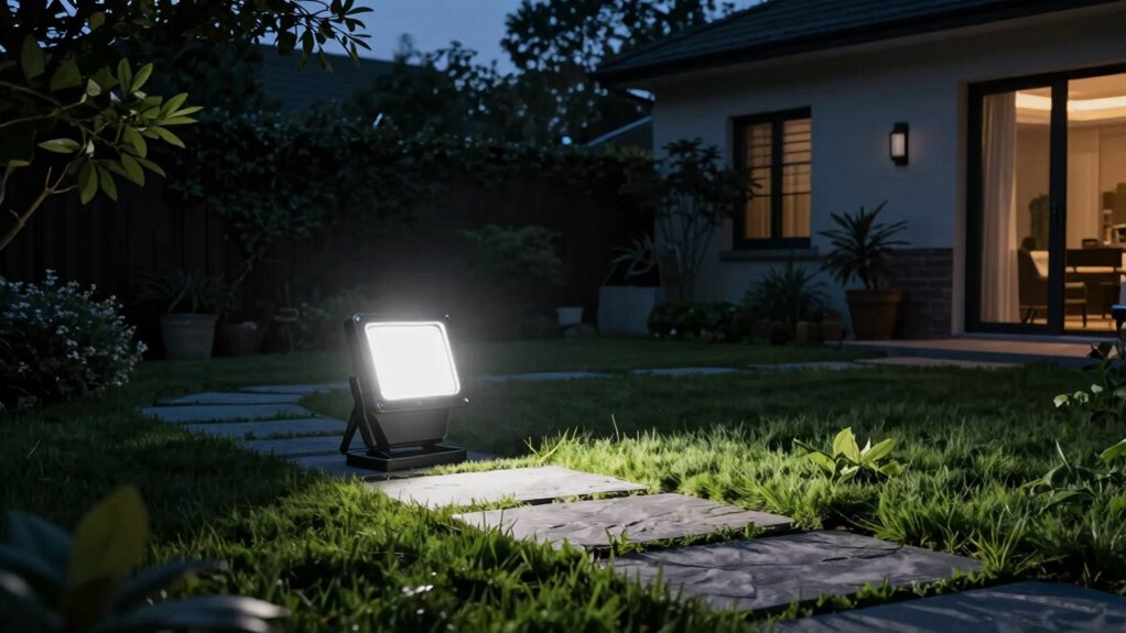 When a motion sensor detects movement, it’s not just about scaring intruders—your outdoor lighting alerts you too. The sensor’s effectiveness means you immediately become aware of activity outside, like a shadow slipping past. The bright flash of lights helps you identify what’s happening, giving you peace of mind or time to react. So, motion sensors serve both as scare tactics and essential tools for homeowner awareness.