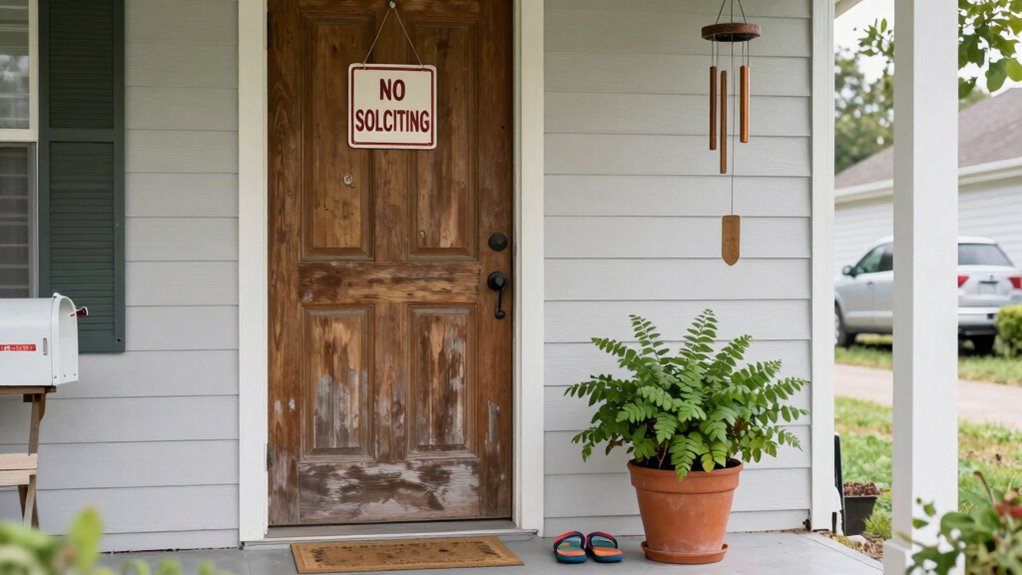 You can subtly indicate your home is unoccupied by using symbolic clues like security cameras or placing fake pets on your porch. These signals suggest activity and supervision, deterring thieves. Keep curtains slightly open or use timers for lights, but avoid obvious signs. Small, strategic details like a bicycle or a pair of shoes also hint at occupancy without drawing attention. These quiet cues protect your home while maintaining a low profile.