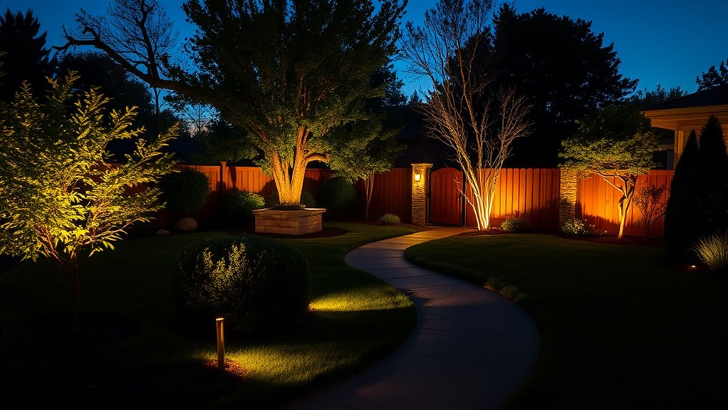 To deter crime in your yard, install strategic lighting around entry points, dark corners, and pathways. Use motion sensors that activate lights instantly, startling intruders and drawing attention. Illuminate walkways to guide visitors safely and prevent hiding spots. Combining pathway and security lights with timers or smart controls enhances coverage and efficiency. Consistent, well-placed lighting creates an environment that discourages malicious activity. Keep exploring for more tips on making your yard a safer place.