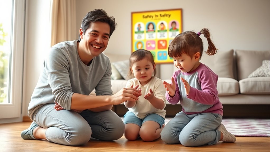 To teach children home safety without fear, use calm, simple language to explain hazards like fire, sharp tools, or chemicals. Show them how to stay safe, such as staying away from matches, and teach them to alert you if they see something dangerous. Regularly practice safety drills and offer reassurance so they feel confident rather than scared. Continuing can help you discover effective ways to create a safe and reassuring environment for your kids.