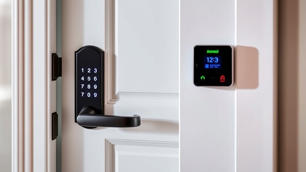 In essence, by integrating smart locks with your alarm system, you make your home smarter, safer, and more responsive. You gain better access control, detailed remote monitoring, and automated routines that adapt to your lifestyle. This seamless connection empowers you to protect your home proactively, providing confidence that your security system works in harmony to keep you safe at all times. Additionally, understanding the core traits of your security system can help you optimize its performance and reliability.