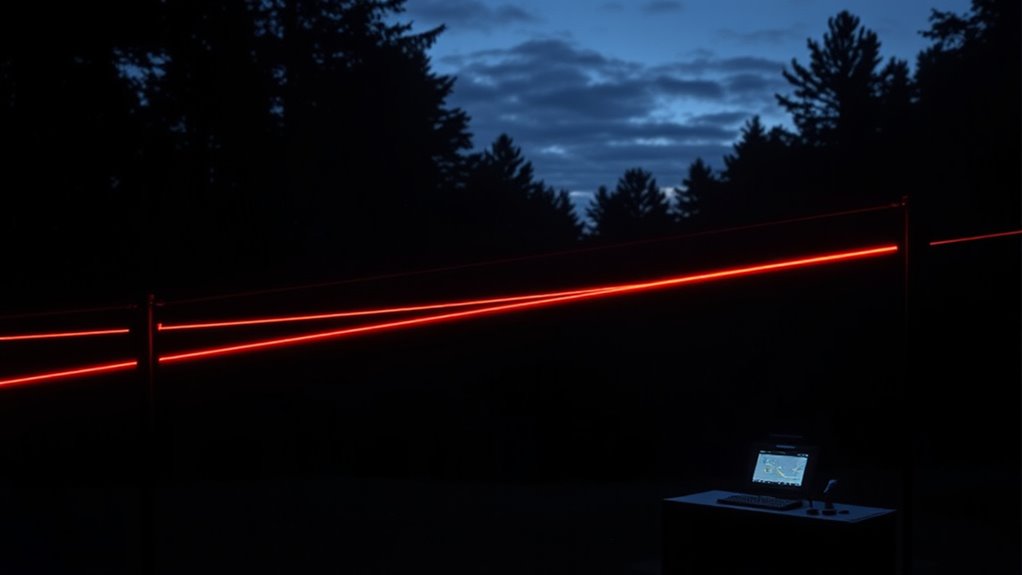 Perimeter laser tripwire systems work by creating an invisible, precise line of laser beams across a designated area. These systems rely on visual detection to monitor movement along the laser path. When an intruder crosses the beam, the system detects the interruption instantly. Infrared technology plays a vital role, enabling the lasers to operate effectively in various lighting conditions and through obstacles like fog or darkness. Unlike traditional security measures, laser tripwires provide high accuracy and minimal false alarms. As soon as the infrared beam is broken, the system triggers an alert, allowing you to respond quickly. This combination of visual detection and infrared technology ensures reliable perimeter security, making it difficult for intruders to bypass the system unnoticed.