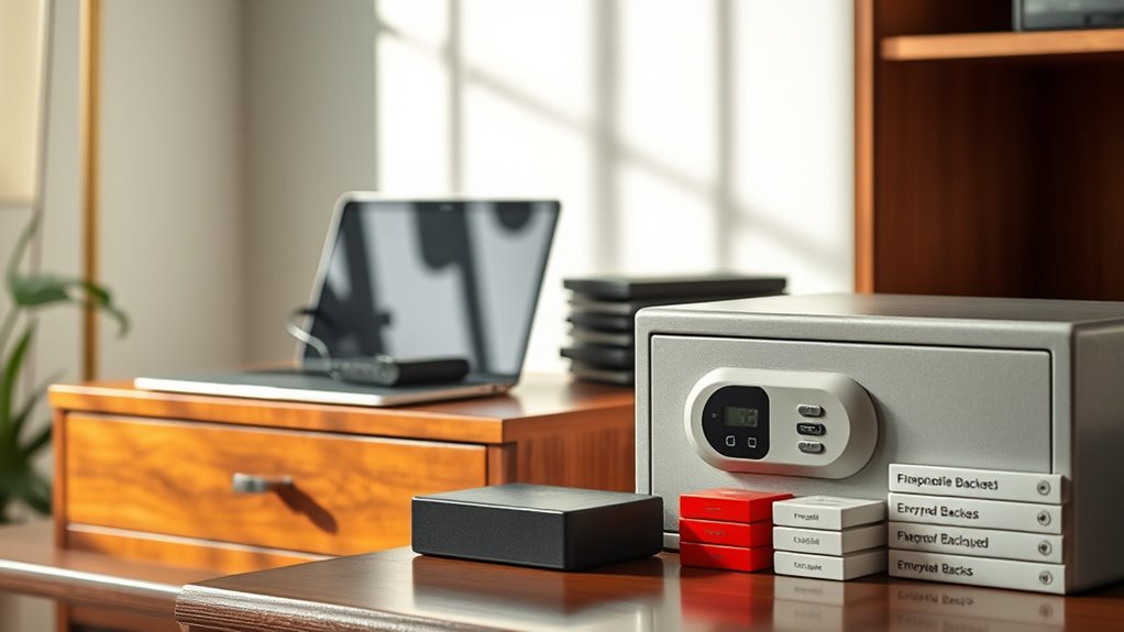 When choosing a secure storage location for your personal data backups, physical security measures are essential to prevent unauthorized access or theft. Consider storing copies in a safe, locked cabinet or a secure drawer in your home. For added protection, use offsite backups like cloud storage, which keeps your data separate from physical risks. Cloud services often have built-in security features, making them a reliable option for safeguarding backups. If you prefer physical copies, keep them in a locked safe or a concealed area, away from prying eyes. Avoid storing backups in easily accessible or vulnerable locations, such as unlocked desks or open shelves. Combining physical security with offsite backups guarantees your data remains protected against theft, damage, or loss. Additionally, understanding data protection strategies can help you implement comprehensive security measures for your backups.