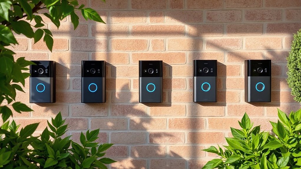 Choosing a battery video doorbell with long battery life means considering installation flexibility, as it directly affects how easily you can set up and reposition your device. Wireless installation options give you the freedom to place the doorbell anywhere without wiring, making setup much simpler. Compatibility with both screw mounting and adhesive methods allows you to install on various surfaces, whether brick, siding, or wood. Portable, battery-powered units can be moved effortlessly to different entry points, offering versatility as your needs change. Flexible installation reduces the need for professional help and adapts to different home layouts. Some models even feature adjustable brackets or angled mounts, enabling you to optimize camera coverage during installation, ensuring you get the best view from the start.