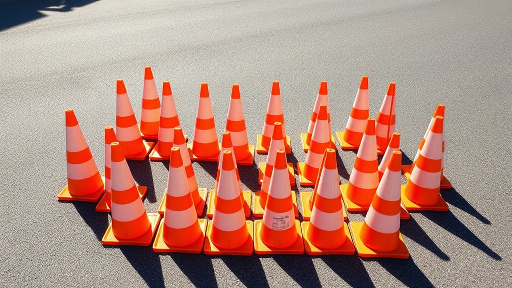 They say safety first, and that’s especially true for traffic cones. I look for cones with high-visibility colors like bright orange or fluorescent yellow, sturdy reflective strips for nighttime visibility, and a non-slip base to prevent accidents. Collapsible cones with reinforced material and secure locking mechanisms also guarantee durability. These features help protect workers and drivers alike, making sure everyone stays safe on the job site.