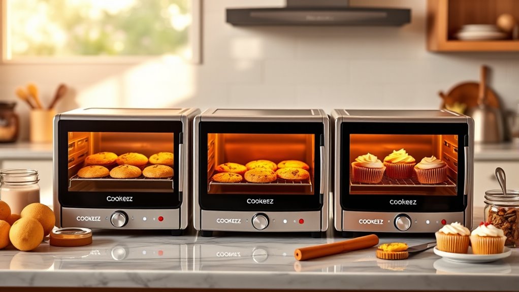 If you’re looking for the best Cookeez Makery ovens to make baking more fun and easy, I recommend the Baked Treatz Oven for realistic baking and plush treats, the Pancake Treatz set with interactive DIY play, and the Toasty Treatz Mini Squishy Friendz for adorable surprises. Each offers unique features like sensory responses, accessories, and collectible plush toys that enhance play. Keep going to discover more about these exciting options and how they can turn pretend baking into an unforgettable experience.