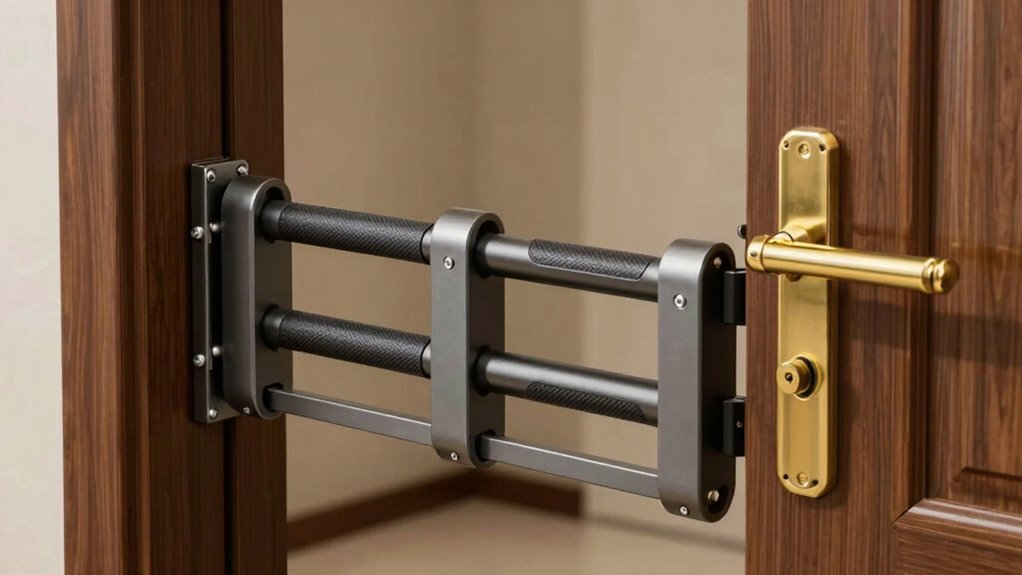 Since the appearance of a door barricade matters just as much as its security features, I pay close attention to the finish options available. Door barricades come in various finishes like silver, white, black, and brushed metal, allowing me to match or complement existing hardware. The aesthetic appeal can enhance my entryway’s look or blend seamlessly with the door’s decor. Many finishes include corrosion-resistant coatings, such as anodized or powder-coated surfaces, ensuring they stay attractive over time. Some models feature sleek, minimalist designs with smooth finishes, avoiding bulky hardware that detracts from my home’s style. The right finish not only improves appearance but also offers discreet security or decorative accents, making my choice both functional and visually appealing.