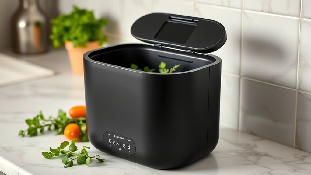 Maintaining a fresh kitchen environment while composting indoors depends heavily on effective odor control features. I look for bins with activated carbon filters or dual filters, as they are excellent at absorbing and neutralizing smells. Sealed lids with airtight seals are also vital—they trap odors inside and prevent unpleasant smells from escaping. Regularly replacing or maintaining filters guarantees consistent odor absorption and prevents buildup over time. Some bins even incorporate odor-neutralizing technologies that naturally absorb smells without relying on chemicals. Additionally, quiet operation combined with these odor control systems helps keep the composting process discreet and odor-free. When choosing a bin, I prioritize these features to keep my kitchen smelling fresh while making composting hassle-free and eco-friendly.