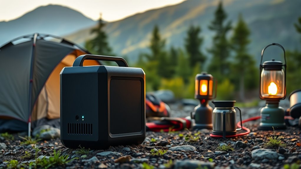 When selecting a lithium power station for camping or emergencies, durability and lifespan are essential factors that can make a significant difference in your experience. High cycle counts, over 1,000, for example, mean the station will serve you reliably for many years. The quality of the battery matters too; Grade-A cells or LiFePO4 chemistry are known for their durability and safety during long-term use. A solid Battery Management System (BMS) protects against overcharging, overheating, and short circuits, which extends the device’s life. Proper maintenance, like regular recharging every 1-2 months and avoiding deep discharges, also plays a critical role. Ultimately, a longer cycle life and good capacity retention ensure your power station remains dependable when you need it most.