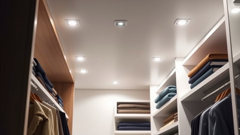 When choosing a motion-activated closet light, taking into account its dimming and color settings is essential to establish the ideal ambiance and guarantee it satisfies your needs. Dimming capabilities let you customize brightness levels from 10% to 100%, giving you precise control over the light intensity. Multiple color temperature options, such as warm white, neutral white, and cool white, allow you to set the mood or match existing lighting. Stepless dimming features enable smooth adjustments without abrupt jumps, enhancing comfort. Some lights offer the ability to save preferred settings, ensuring consistent lighting every time. Control options like remote controls, touch panels, or app interfaces make it easy to tweak brightness and color on the spot, providing versatile and user-friendly customization.