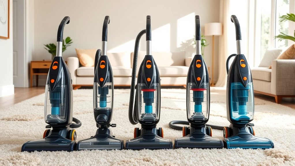 The effectiveness of a pet carpet cleaner’s formula is vital for permanently removing stains and odors. I look for enzyme-based agents that break down organic messes at a molecular level, guaranteeing stubborn stains are eliminated. Dual-activated or oxygen-based formulas boost stain removal power by actively lifting embedded pet messes, making cleaning more efficient. Pet-specific solutions are designed to target lingering odors from urine, smoke, and other organic sources, preventing re-soiling. Fast-acting ingredients are essential because they help guarantee stains and odors are removed quickly and permanently. To maximize results, I prefer formulas that work hand-in-hand with powerful suction and specialized tools, providing deep cleaning and effective odor neutralization. This combination guarantees a fresher, cleaner space after every use.