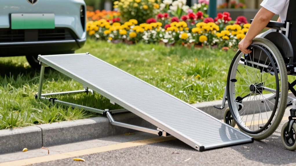 Choosing a portable ramp that can safely support your weight and mobility device is essential for guaranteeing stability and safety. It’s important to select a ramp with a weight capacity that exceeds the combined weight of you and your equipment. Most portable ramps support between 600 to 800 pounds, which suits the needs of most users. However, always check the manufacturer’s specifications to confirm it can handle your specific weight requirements. Overloading a ramp beyond its limit can cause structural failure and safety hazards. For heavier loads or multiple users, opt for ramps with higher capacities, such as 1,000 pounds or more. Prioritizing the proper weight capacity ensures a safe, reliable, and durable solution for your mobility needs.