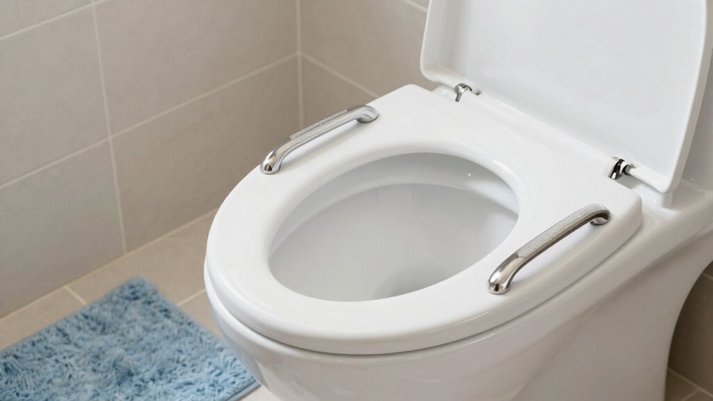 A secure handle grip is vital for safety and confidence when using a raised toilet seat with handles. I look for handles that are non-slip and padded to prevent slipping and provide comfort during use. Handles placed at the right height and width help improve stability, reducing the risk of falls when sitting or standing. Durability matters too—handles should be made from sturdy, wear-resistant materials to maintain a firm grip over time. Textured surfaces are a plus, especially for users with limited hand strength or arthritis, as they offer better traction. Proper installation is essential; handles must be firmly attached to prevent wobbling or detachment during use. A secure handle grip not only enhances safety but also boosts independence and confidence.
