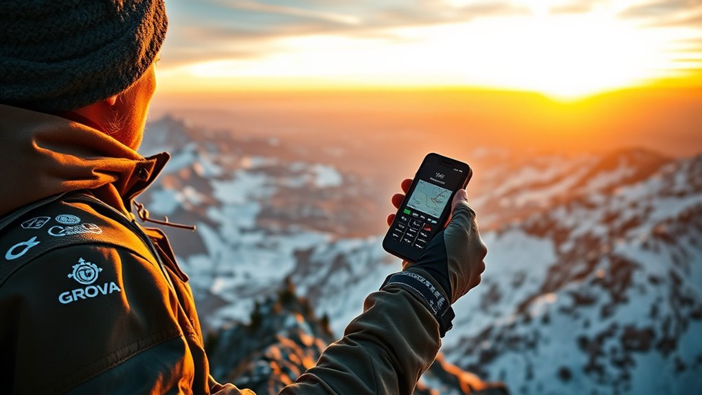 Ensuring your satellite phone can withstand harsh conditions is essential for remote travel emergencies, as tough environments demand tough devices. Look for phones that meet military-grade durability standards like MIL-STD 810F, which guarantee resistance to shocks, vibrations, and extreme temperatures. An IP65 ingress protection rating indicates the device is dust-tight and water-resistant against jets, perfect for outdoor adventures. Ruggedized phones often feature shockproof, dustproof, and water-resistant construction, crucial for surviving drops, debris, and exposure. Reinforced impact-resistant casings and sealed ports prevent damage from physical stresses and environmental elements. These durability standards guarantee your device remains operational in high humidity, temperature fluctuations, and rough terrains, giving you confidence that your satellite phone can handle the demanding conditions of remote travel emergencies.