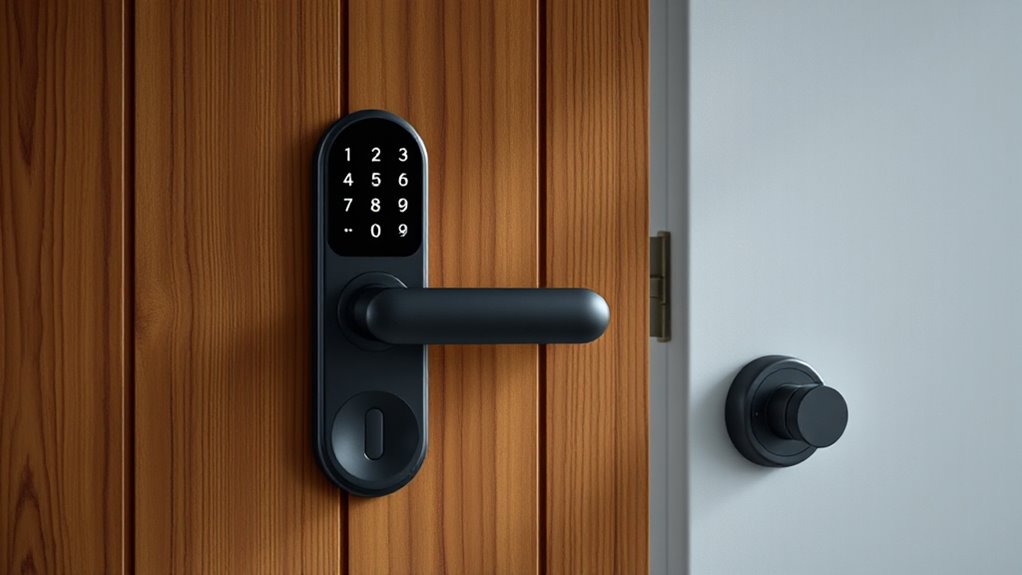 The installation process for these smart lock and handle sets usually involves removing your existing lock, installing the new deadbolt and handle, and then connecting it to your Wi-Fi or smart home system. I recommend reading the manufacturer’s instructions carefully, as some models might require a screwdriver or drill. Once installed, I typically test the lock remotely or via an app to guarantee everything works smoothly.