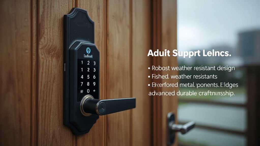 Smart locks withstand extreme weather by using durable materials like stainless steel and weatherproof seals that prevent water and dust from entering. I’ve found that they’re designed with robust construction and corrosion-resistant components, so they can handle rain, snow, and heat without issue. Additionally, some models include protective coatings and sealed electronics, ensuring reliable operation no matter the weather conditions, giving me peace of mind year-round.