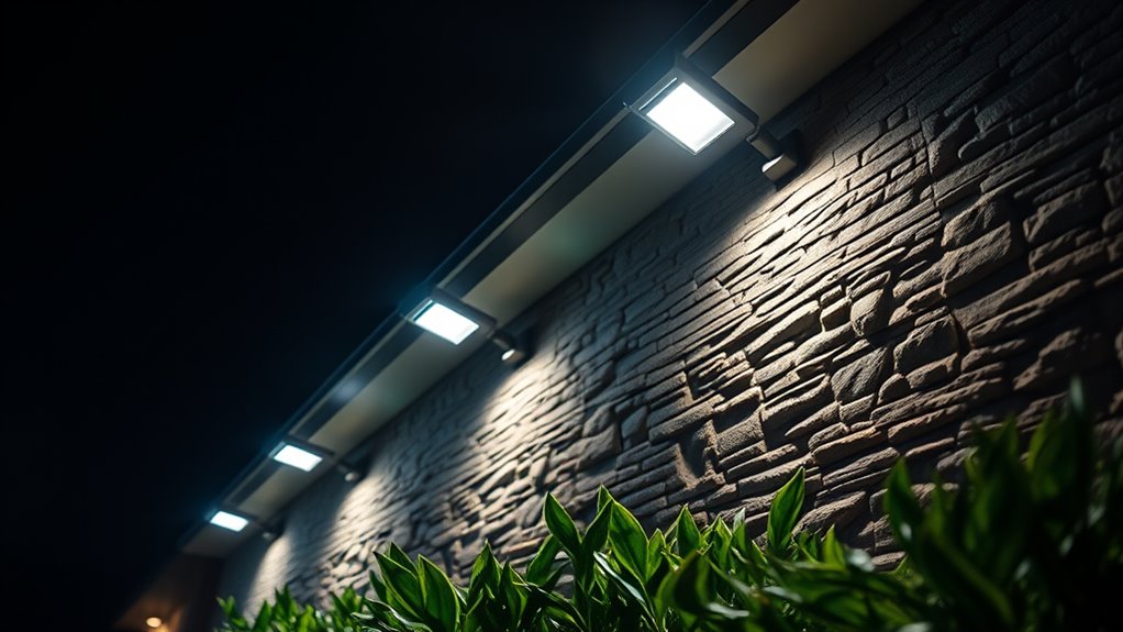 Durability and weatherproofing are essential factors to contemplate because your solar motion light needs to withstand the elements year-round. I look for lights with an IP65 or higher waterproof rating, ensuring they resist heavy rain, snow, and harsh outdoor conditions. Choosing models made from durable materials like ABS, polycarbonate, or high-impact plastics is vital, as these resist shocks, UV rays, and temperature swings. I also verify that they have weatherproof seals and gaskets around joints and wiring to prevent water ingress and corrosion. Reinforced mounting brackets and sturdy, adjustable heads are important to endure wind, debris, and frequent adjustments. Ultimately, I prefer lights that perform reliably across extreme temperatures, ensuring consistent security regardless of climate.