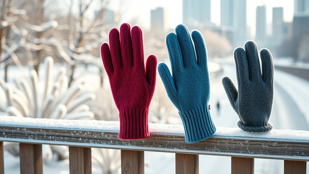 To keep your hands warm in cold weather, it is critical to look for gloves made from insulating materials like polyester, fleece, or spandex that effectively trap heat. These fabrics create a barrier against the cold, helping your hands stay cozy. A snug fit is essential because it prevents heat from escaping and enhances thermal efficiency. For extremely cold conditions, opt for gloves with extra lining, such as fleece or thermal layers, which provide additional insulation. Keep in mind that windproof and water-resistant features also play an important role in maintaining warmth, as they block cold wind and snow from penetrating the gloves. Prioritizing these insulation factors ensures your hands stay warm and functional, no matter how chilly the weather gets.