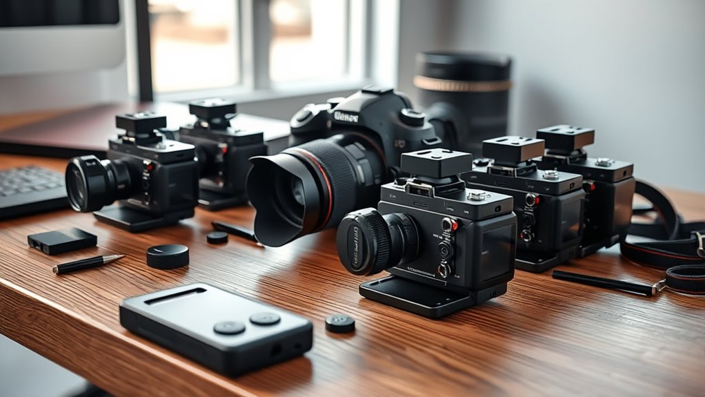 When selecting a tracker for my camera gear, I focus on compatibility with my equipment to guarantee everything fits and functions smoothly. I also consider battery life, ease of setup, and how portable the device is for my shoots. Finally, I check if it offers reliable control and connectivity options to keep my workflow seamless.