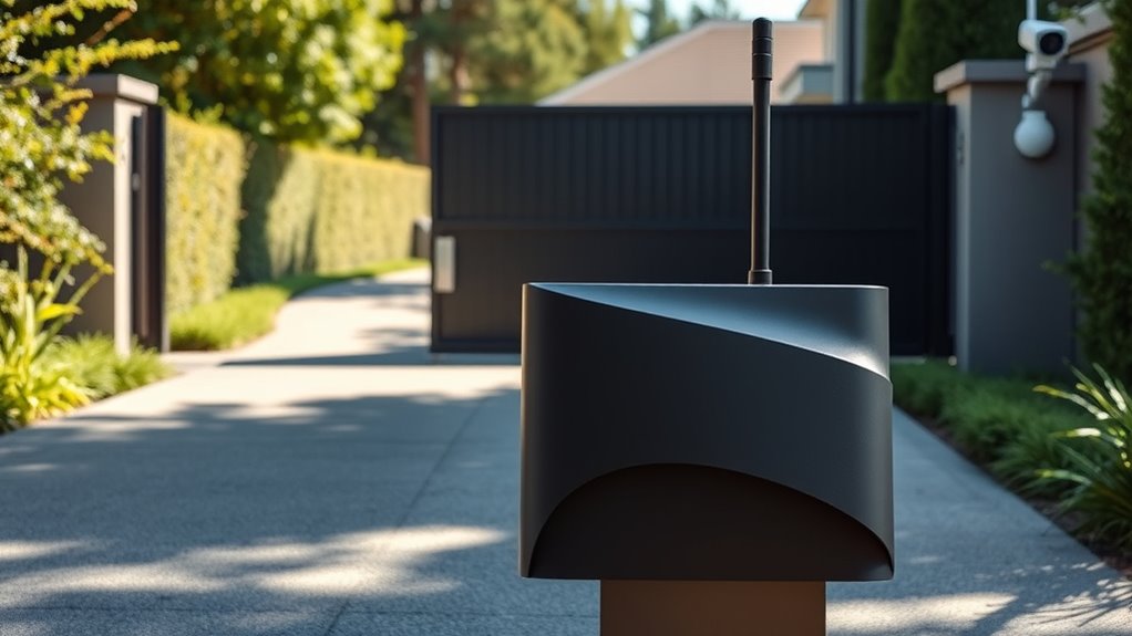 The remote range of a driveway gate opener directly affects how conveniently I can operate my gate from different locations on my property. Typically, ranges vary from 100 to 1,000 feet, offering flexibility depending on my needs. A longer range means I can open the gate from inside my house or across a large yard without getting too close. However, factors like antenna placement, obstacles, and interference from metal structures can reduce the effective distance. Many openers specify their maximum range under ideal conditions, but real-world performance may differ. To make certain of smooth operation and security, I look for a model with a range that comfortably covers my property’s size. This way, I avoid frustration and can access my gate effortlessly from various distances.